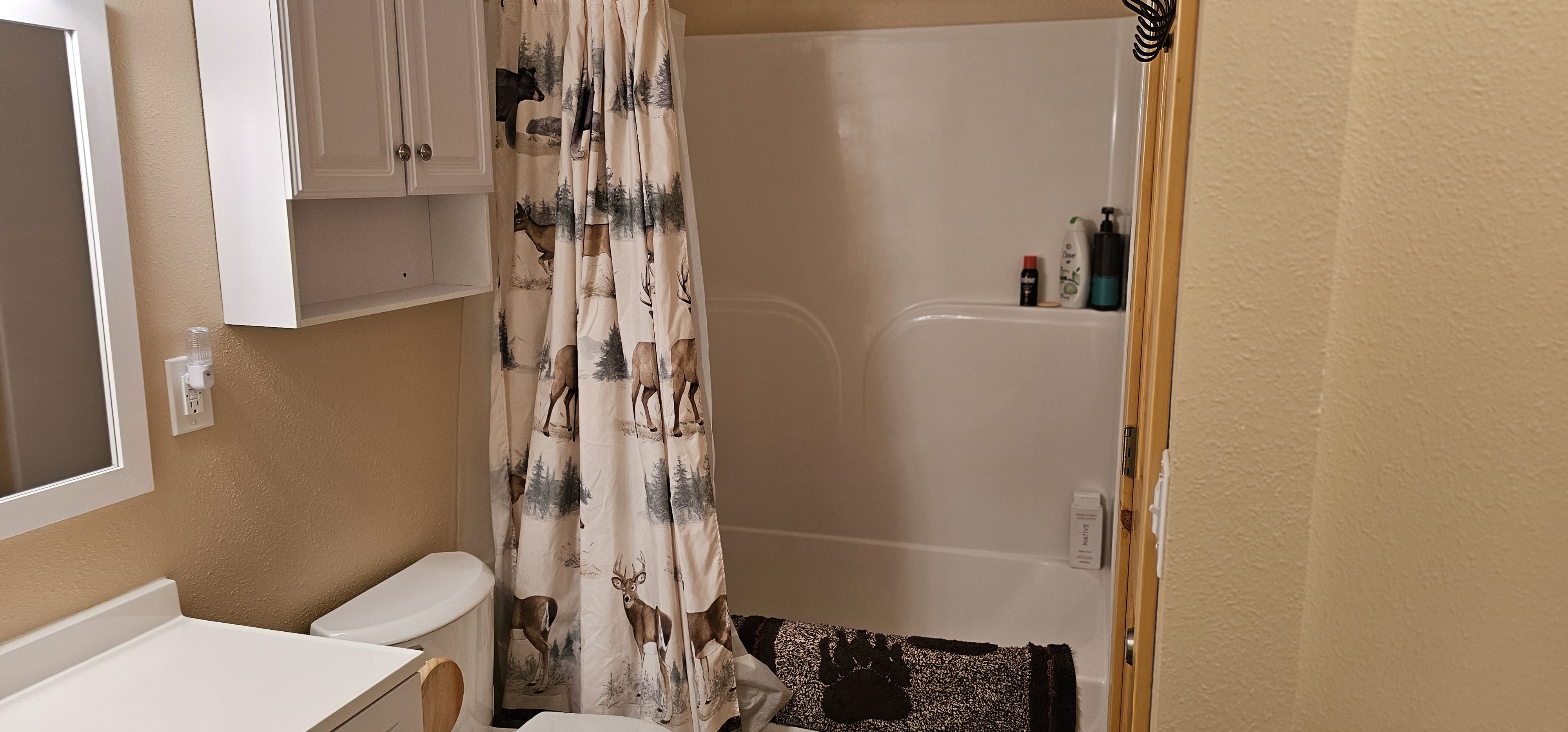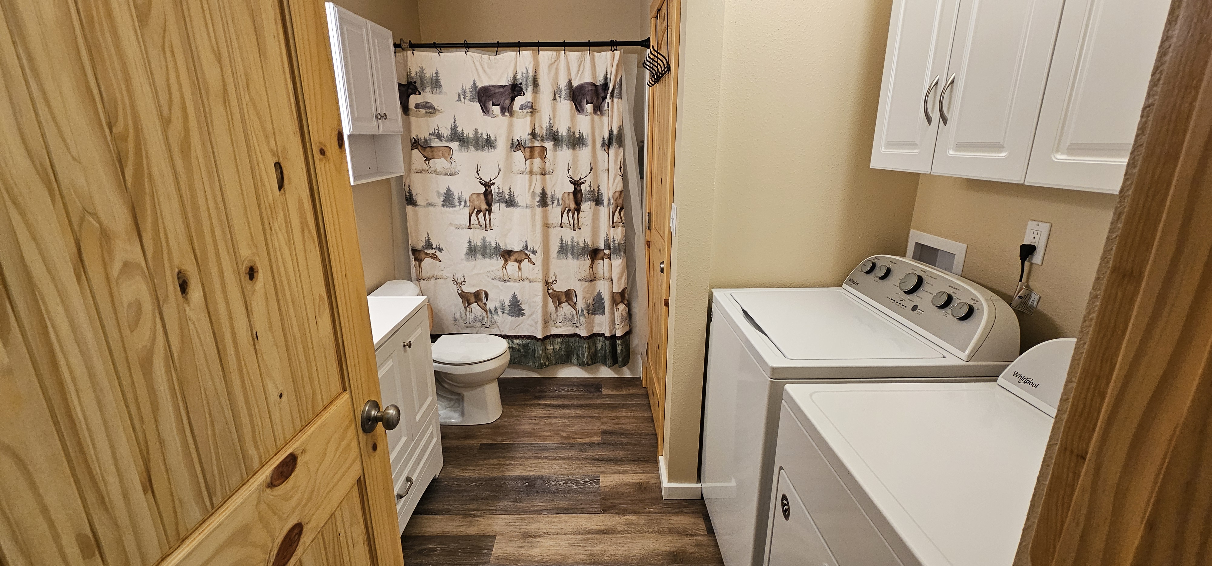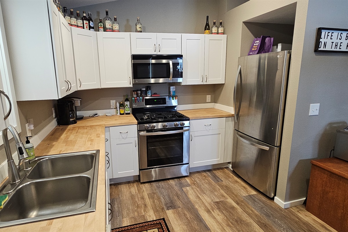 With a classic cabin exterior and a bright, modern interior, this home offers the best of both worlds. Inside, you’ll find a super clean, thoughtfully designed space featuring three comfortable bedrooms and a full bathroom, accommodating up to eight guests. The fully equipped kitchen comes stocked with everything you need to prepare meals, while the spacious dining table seats eight—perfect for gathering after a day of adventure. A cozy living room with a sofa sleeper provides additional sleeping space.